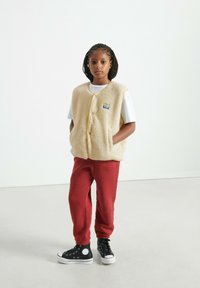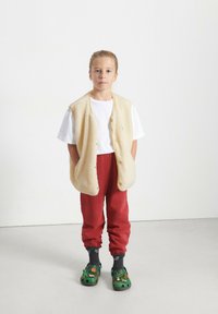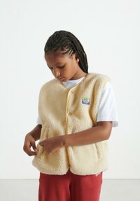 Smėlinio spalvos fliso liemenė su minkšta tekstūra, apvalia apačia ir geltonu apvadu. Ant liemenės yra logotipo pleistras ir priekiniai mygtukai. Dėvima ant balto marškinio.