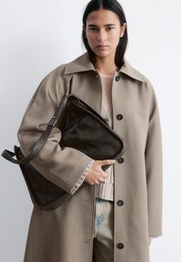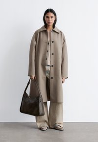 Moteris dėvi smėlio spalvos ilgą paltą virš megztinio ir plačių kelnių, rankoje laiko tamsiai rudos spalvos rankinę, stovi prie baltos sienos.