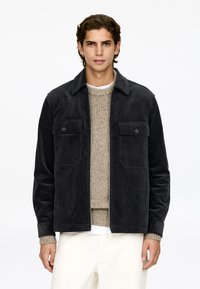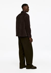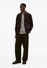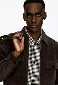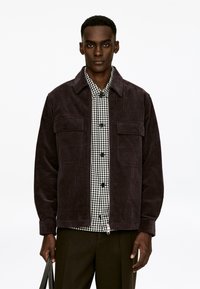 Tamsiai rudas kordūrojo švarkas su dviem krūtinės kišenėmis ir užtrauktuku priekyje. Po juo slepiasi juodai balta vaflinė marškinėliai su sagų eiliuke.