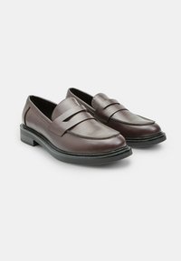 Tamsiai rudi odiniai bateliai be raištelių su lygiu paviršiumi, viršuje su dirželiu, apvalia priekine dalimi ir žemu juodu guminiu padu.