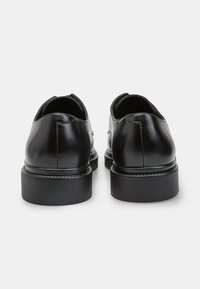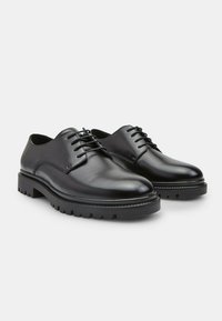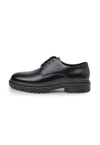 Juodi odiniai bateliai su lygia apdaila, apvaliu nosimi ir kontrastinga tvirta guminė pado dalimi su giliais įspaudais bei šešiais batraiščio skylutėmis.
