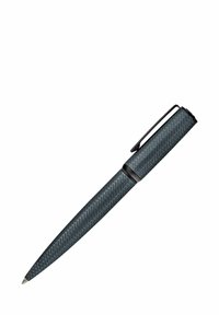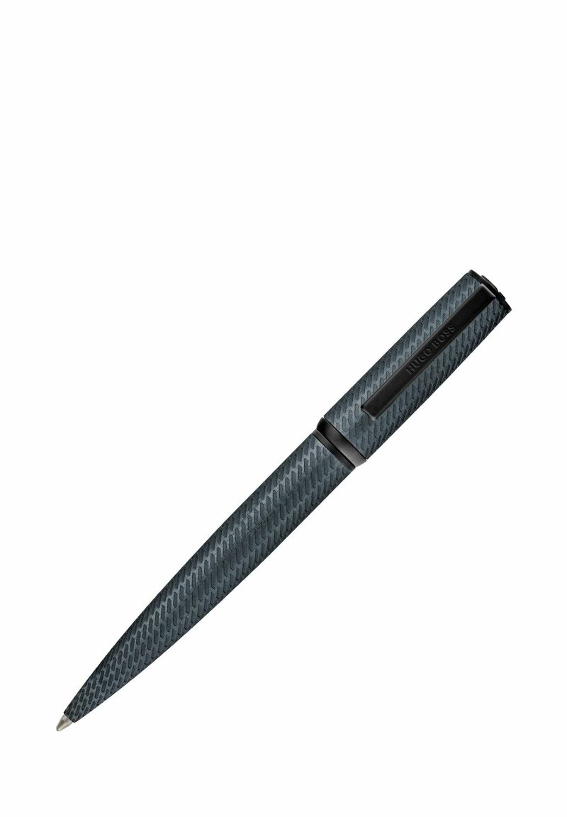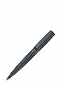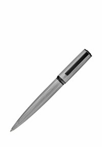 Elegantiška tamsiai pilka rutulinė tušinukas su tekstūruotu įstrižiniu raštu, juodas spaustukas su prekinio ženklo graviravimu ir siaurėjančiu rašymo galiuku.