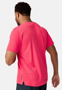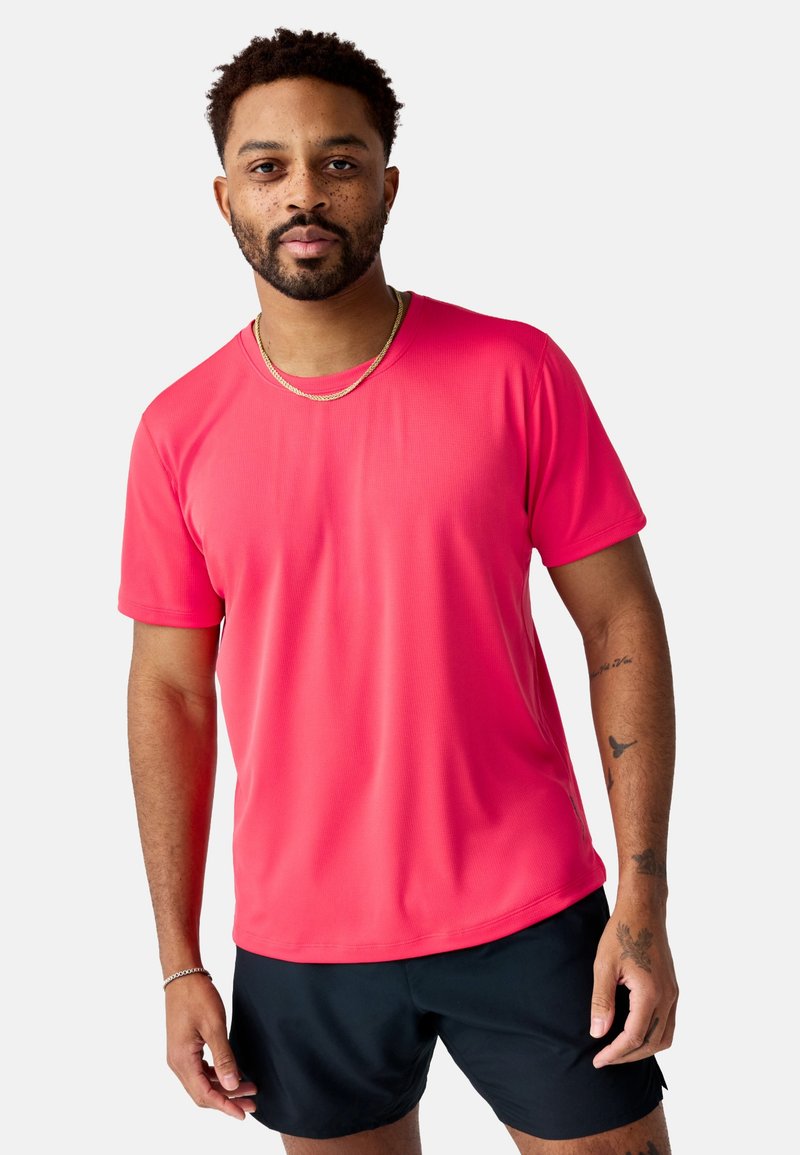 Vyras su barzda ir tatuiruotėmis, dėvintis ryškiai rožinę trumpomis rankovėmis marškinius ir juodus šortus, stovintis priešais vienspalvį baltą foną.