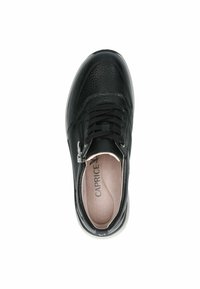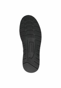 Juodi tekstūruoto odos sportbačiai su raišteliais, šonine užtrauktuku, kontrastingu pilku tarpinio pado sluoksniu ir juoda guminė pada.