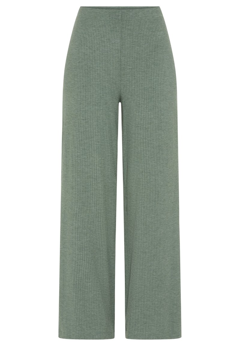Aukštos liemens, plačių kojų megzti ribuoti kelnės ramiai šalavijų žaliame atspalvyje, tiesaus kirpimo su be siūlių juosmeniu.