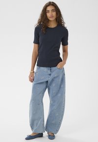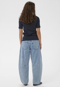 Moterys su garbanotais rudos spalvos plaukais, vilkinčiomis tamsiai mėlyną trumpomis rankovėmis megztinį ir šviesiai mėlynas džinsas su mažomis gėlėmis siuvinėtu raštu, stovinčios prieš baltą foną.