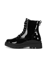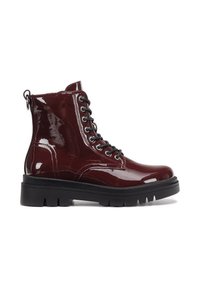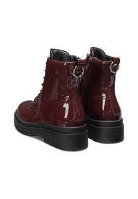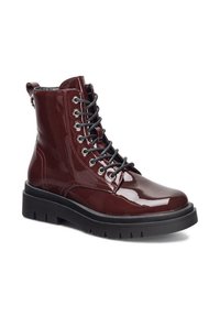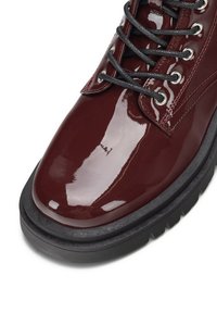 Bordo lakuotos odos kulkšnies batai su juoda gumine sola, priekyje suvarstomi raišteliais ir turi užtraukiamą juostelę, apvaliomis nosimis ir siūtais akcentais.