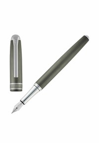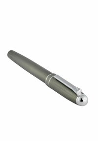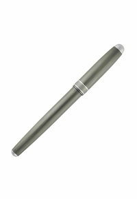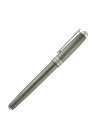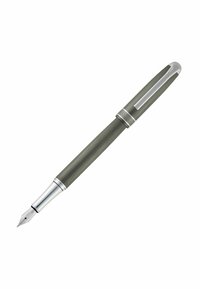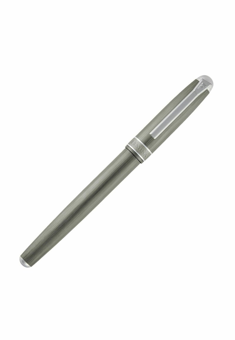 Elegantiška pilka fontaninis rašiklis su sidabriniu segtuku ir apvadu, pasižyminti šlifuotos metalo tekstūros paviršiumi ir lygiu cylindriniu profiliu.