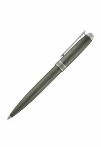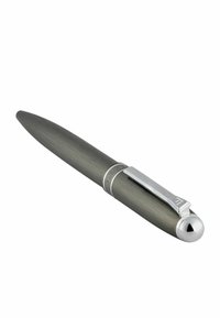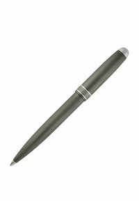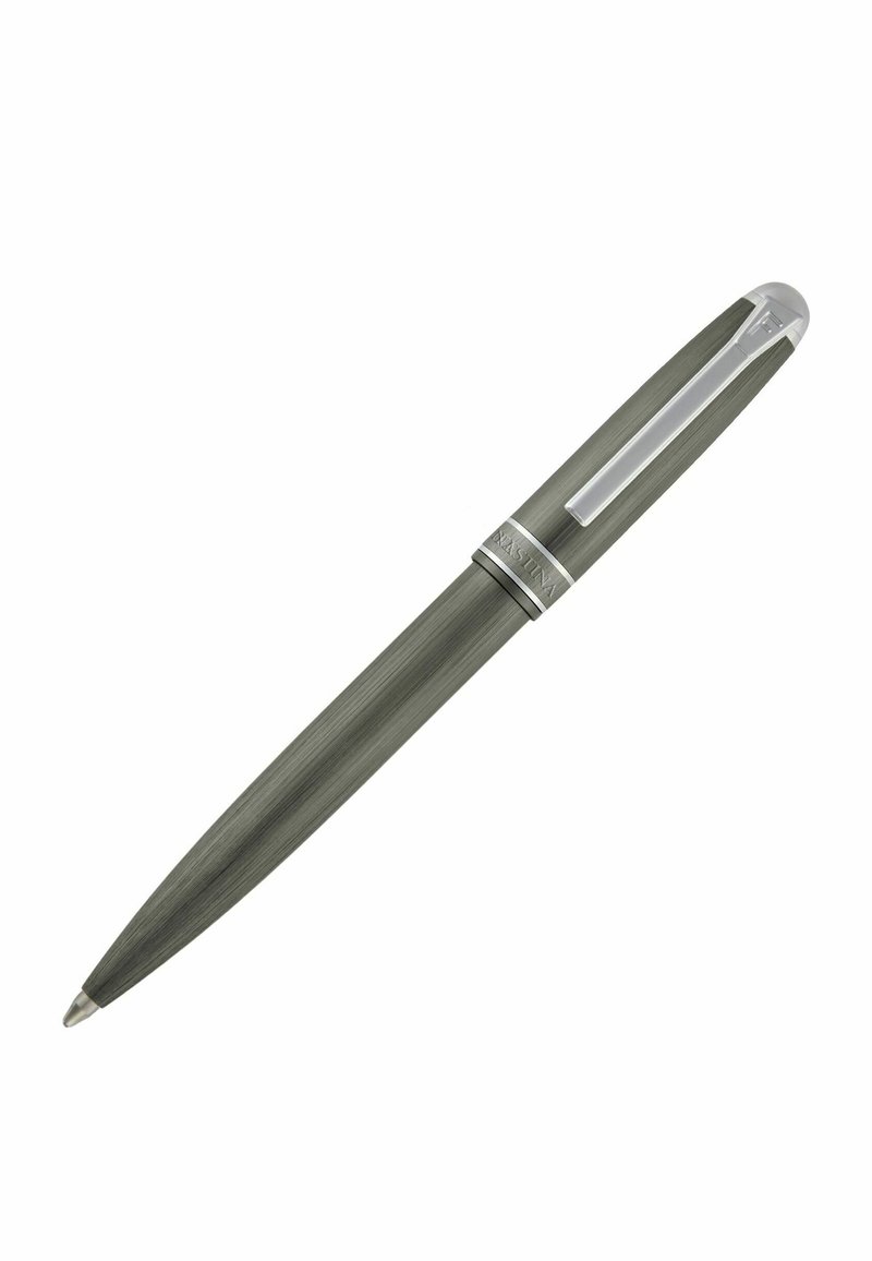 Tamsiai pilkas metalinis rutulinis rašiklis su sidabriniu spaustuku ir dangtelio juosta, pasuktas kampu ant balto fono.