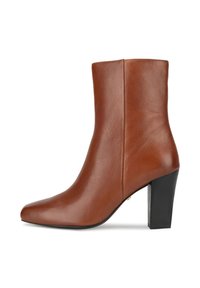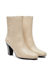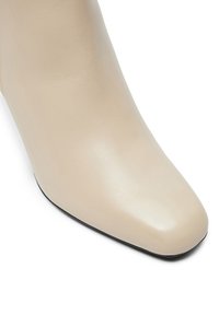 Smėlio spalvos odiniai kulkšnies aulinukai su smailiu noseliu ir juodu stambiu kulnu. Šonuose yra užtrauktukas su auksiniu akcentu.