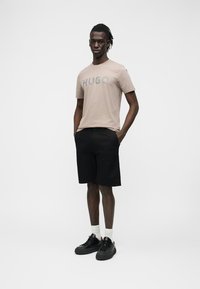Vyras dėvi smėlio spalvos trumpomis rankovėmis marškinėlį su užrašu „HUGO“ ir juodus kelio ilgio šortus, stovintis priešais paprastą baltą foną.