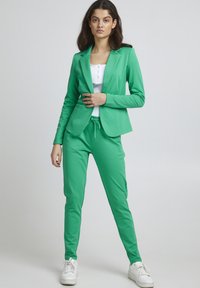Jauna moteris, vilkinti žalią švarkelį ir derančias kelnes, dėvi baltą, pieštinę su sagomis palaidinę, liesdama plaukus priešais neutralią foną.