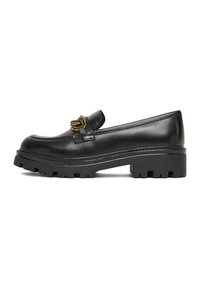 Rudi odiniai batai su juoda stora pada, viršuje puošiami auksine grandinėle. Derinami su siūtais tamsiais kelniais.