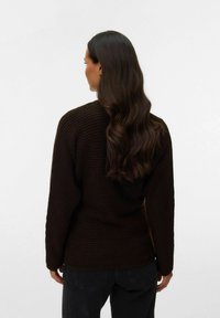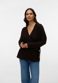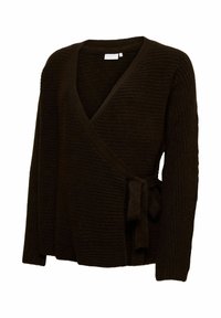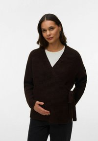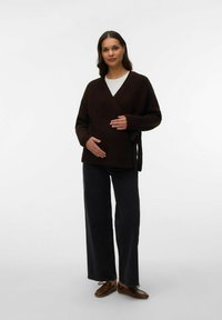 Moteris su tamsiais plaukais, dėvinti rudą megztinio apvyniojimą virš balto viršaus, švelniai laikanti pilvą, stovinti priešais paprastą šviesią foną.