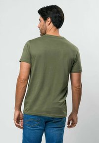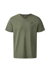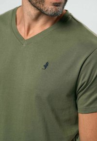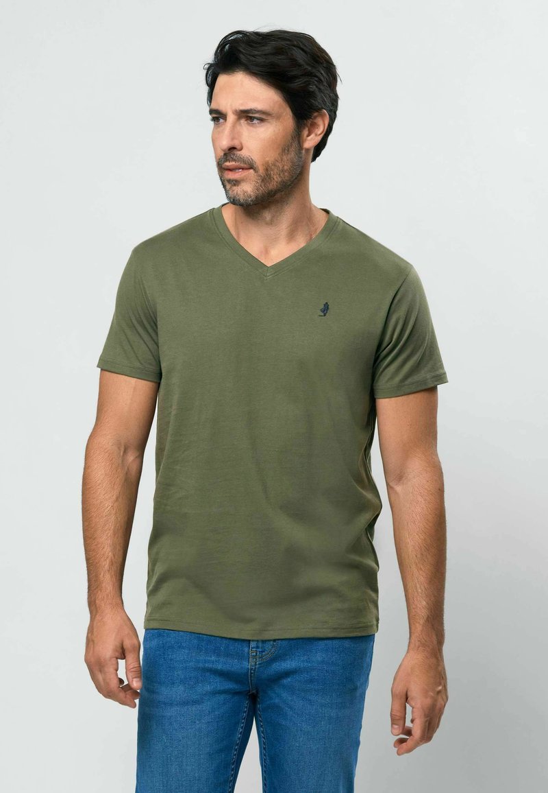 Alyvuogių žalumos V formos kaklo marškinėliai iš minkštos medžiagos, su trumpomis rankovėmis ir mažu mėlynu logotipu kairėje krūtinės pusėje. Dėvimi su mėlynais džinsais.
