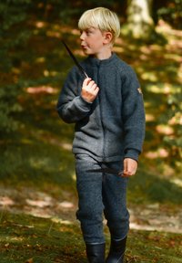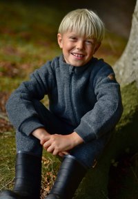 Pilkas vilnonis švarkas ir kelnės su užtrauktuku, tekstūruota medžiaga ir mažas logotipas; vaikas laiko tamsų plunksną, dėvi guminius batus.