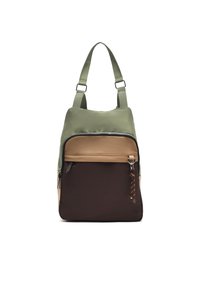 Kompaktiška kuprinė su smėlio, rudų ir kremų spalvų blokais, priekyje yra užtrauktuko kišenė su pynimo juostele ir reguliuojamos kremų spalvos petnešos.