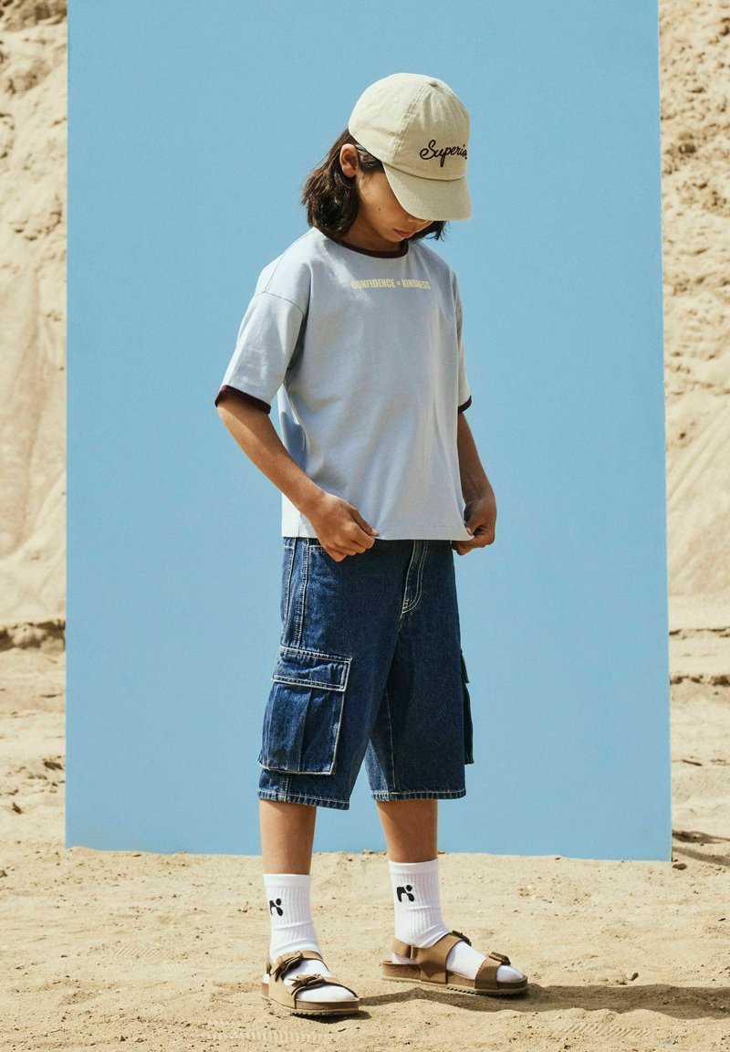 Vaikas, dėvintis smėlinės spalvos kepurę, šviesiai mėlyną marškinėlį, džinsinius kargo šortus, baltas kojines ir basutes, stovi ant smėlėto paviršiaus prieš mėlyną foną.