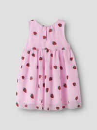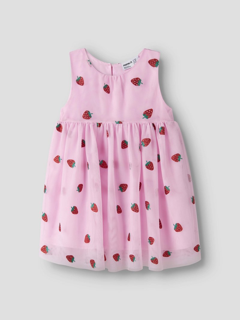 Rožinė rankovių neturinti mažylio suknelė su raudonais braškių raštais ir suknelės apačia raukšlėta, išdėstyta lygiai ant šviesios fono.