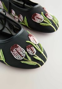 Juodos tinklinės Mary Jane stiliaus lygios avalynės su sagties dirželiu ir rožinės bei žalios gėlių karoliukų siuvinėjimu šone.