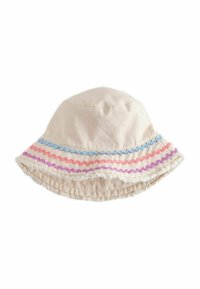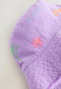 Šviesiai violetinė kibiro formos skrybėlė su siuvinėtais saulės, bangų, žvaigždžių, gėlių ir palmės medžio motyvais aplink kraštą.
