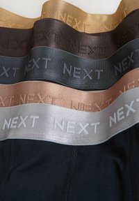Penki juodi bokso šortų poros su elastingais juosmens diržais skirtingų metalinių spalvų, kiekviena paženklinta žodžiu „NEXT“.