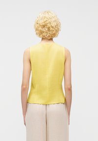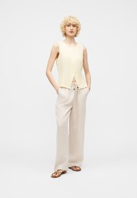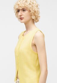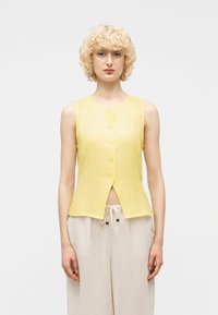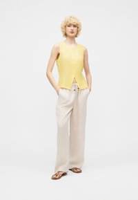 Asmuo su trumpais garbanotais blondiniais plaukais, dėvi geltoną rankovių neturintį palaidinuką su sagomis ir šviesiai smėlio spalvos kelnės su raišteliais, stovi priešais vientisą foną.