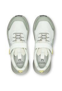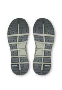 Šviesiai pilki sportiniai bateliai su tekstūruotu viršumi, kontrastingomis žaliomis detalėmis ir storu padu, kuriame matomas amortizavimas ir apvali forma.