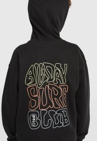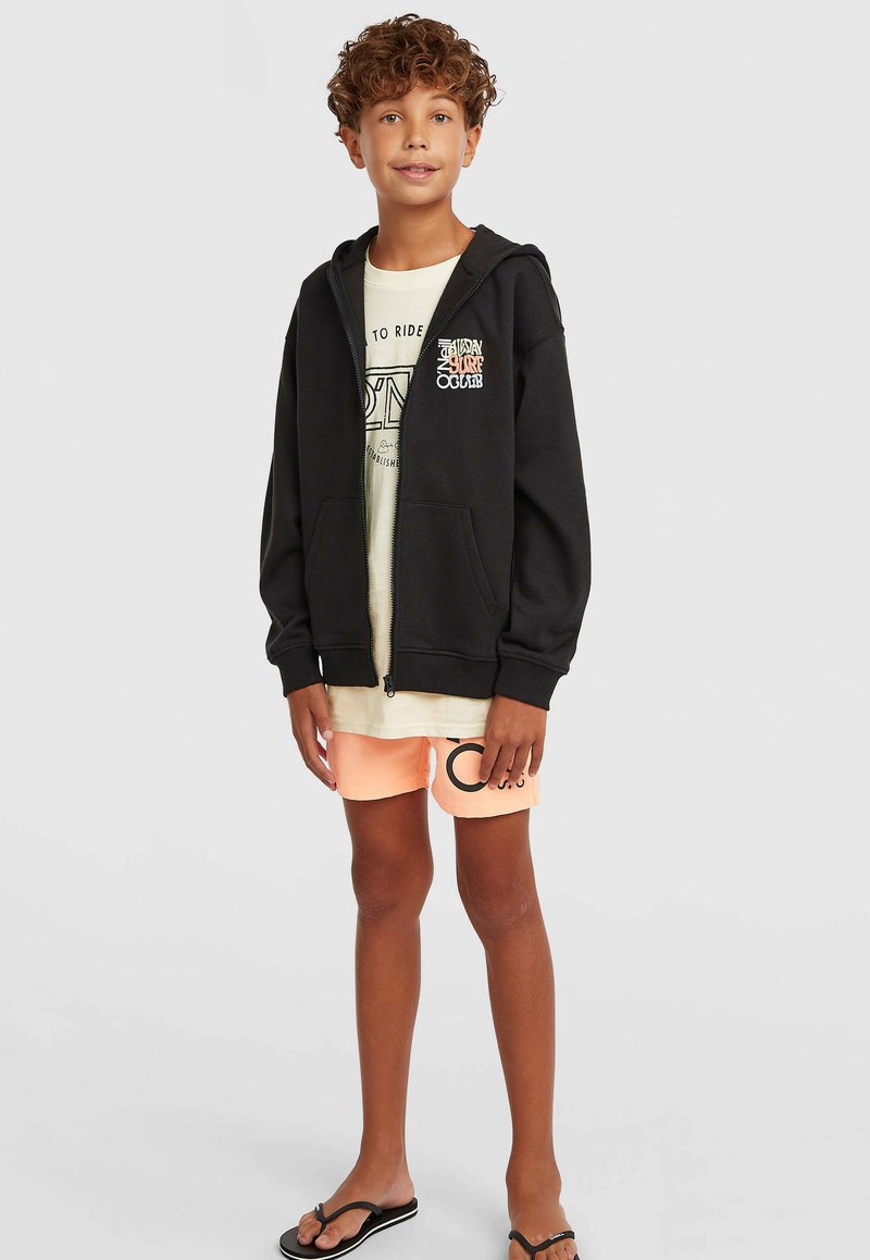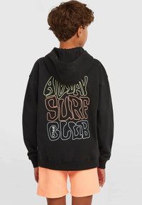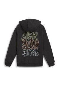 Juodas medvilnės mišinio užsegamas džemperis su užtrauktuku, turintis priekinės kišenes ir spalvingą banglenčių klubo logotipą. Dėvimas ant šviesios marškinėlių ir persikų spalvos šortų.