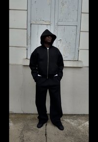 • Juodas zip-up džemperis pagamintas iš storos medžiagos, su gobtuvu ir priekinėmis kišenėmis. Poruojamas su derančiomis sportinėmis kelnėmis, prieš neutralų fon�ą.