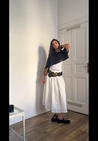 • Balta, plazdanti sijonas su tekstūruota medžiaga; sluoksniuota juoda viršutinė dalis, tamsiai rudas diržas su apvaliais akcentais; juodi batai su išpjovų dizainu.