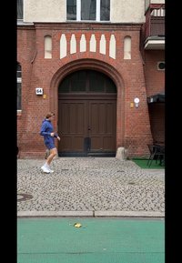• Asmuo tamsiai mėlyno gobtuvo striukėje ir šortais peršoka betoninę barjerą su oranžinėmis detalėmis, nešiodamas baltus sportinius batelius ir kojines.