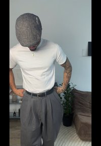 • Vyras, dėvintis pilką butonierinę kepurę, baltą marškinėlį, pilkas raukšlėtas kelnes ir su tatuiruotėmis ant rankos, stovintis sukryžiavęs rankas ant klubų prie baltos sienos.