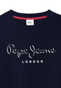 Tamsiai mėlynas medvilninis džemperis su apvalia iškirpte, ilgomis rankovėmis ir baltu užrašu „Pepe Jeans LONDON“ priekyje.