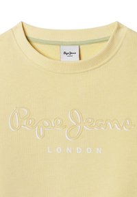 Geltona minkšto audinio bliuzonas su siuvinėta baltos spalvos "Pepe Jeans" logotipu. Apskritimo formos kaklas ir elastinės rankogaliai bei apačia.
