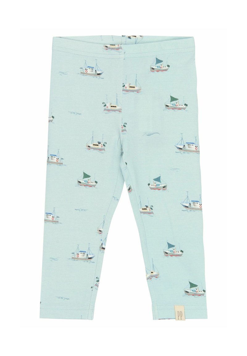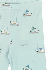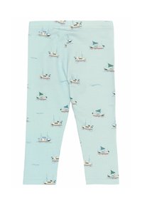 Šviesiai mėlynos legging'os, pagamintos iš švelnios medžiagos, su pasikartojančiu jūrinio stiliaus raštu, vaizduojančiu mažas valtis su žaliomis ir baltomis burėmis.