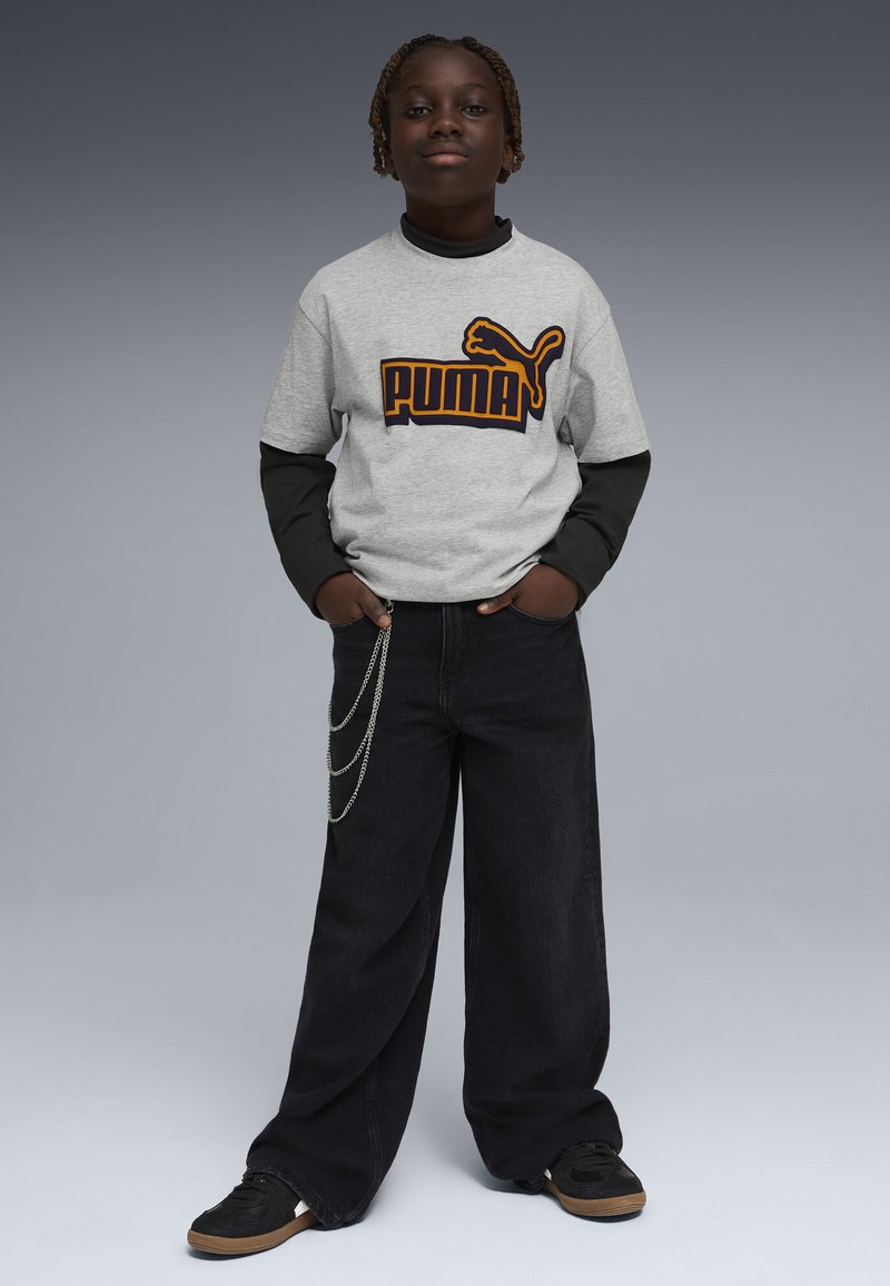 Vaikas stovi kišenėse laikydamas rankas, dėvi pilką Puma marškinėlį per juodą ilgomis rankovėmis, juodas plačias kelnes su grandinėlėmis ir juodus sportbačius.