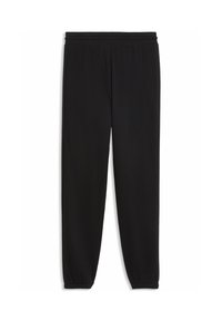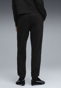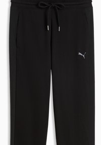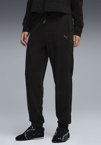 Juodos sportinės kelnės su elastine juosta, puoštos baltu Puma logotipu. Derinamos su baltomis sportinėmis bateliais ant pilko grindų.