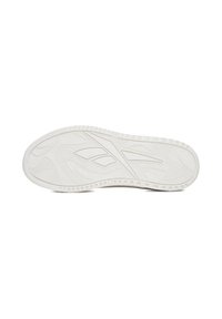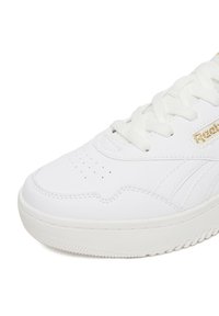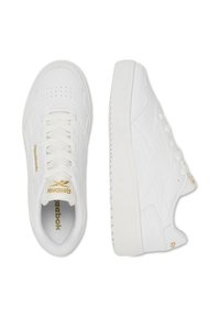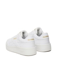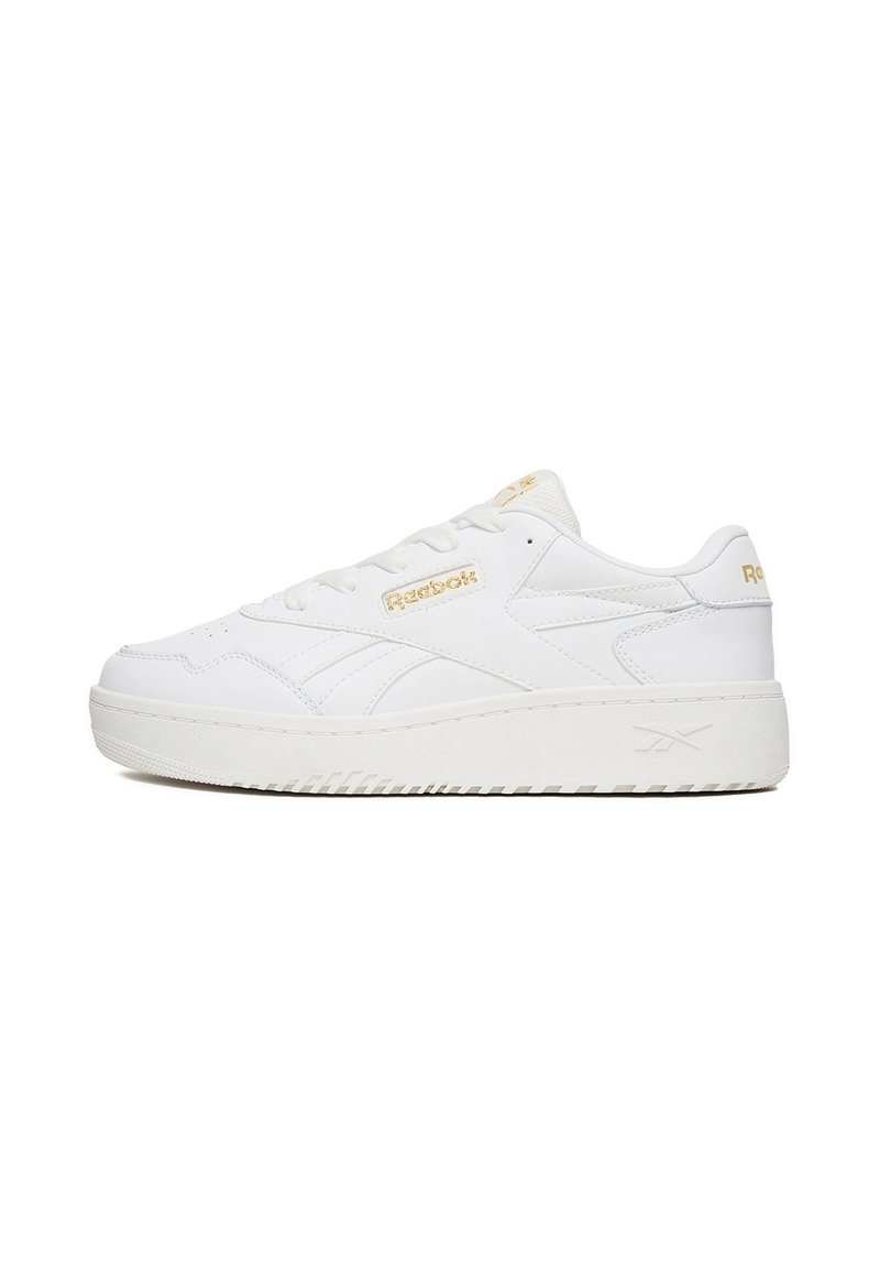 Balta žemo profilio „Reebok“ sportbačio su auksiniais logotipais, raišteliais užsegamu uždarymu ir storu padu šoninė nuotrauka ant paprasto fono.