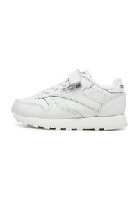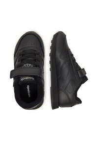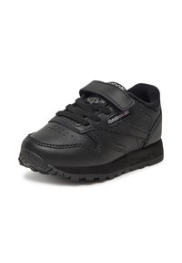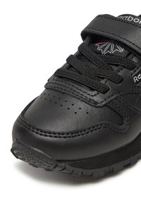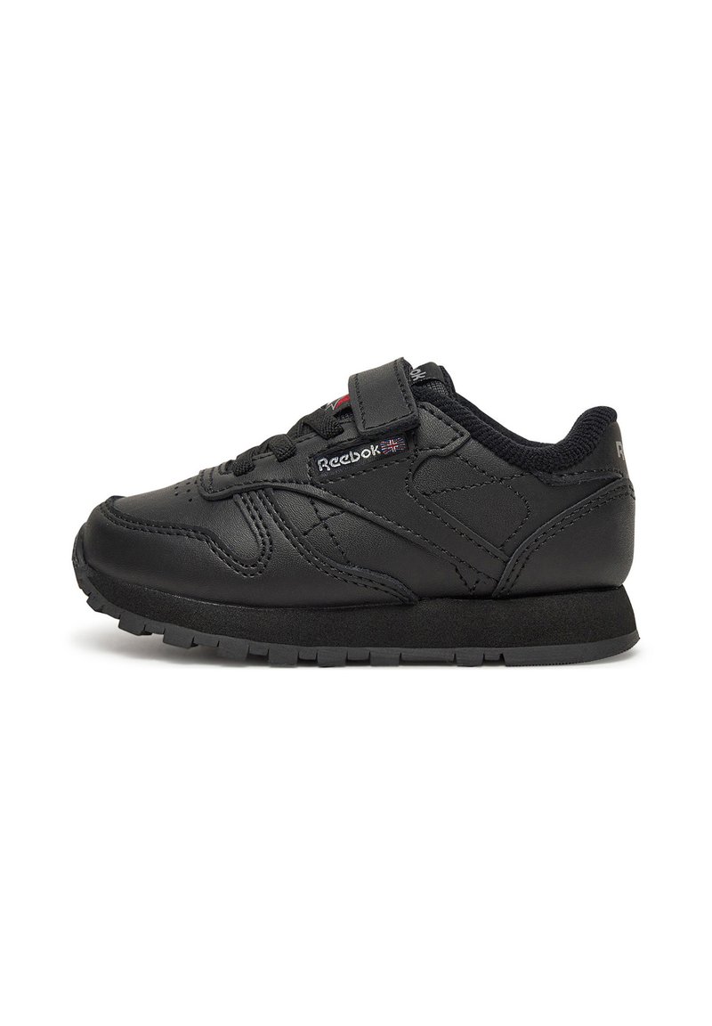 Juodi „Reebok“ sportbačiai iš sintetinės odos, žemo profilio dizainu, apvalia priekiu, raišteliais ir lipniu dirželiu, užtikrinančiu saugų prigludimą.