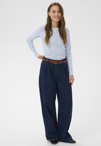 Moteris su ilgais rudos spalvos plaukais, vilkinti šviesiai mėlyną nėriniuotą ilgomis rankovėmis palaidinę, įkištą į tamsiai mėlynas aukšto liemens kelnes su rudu diržu.