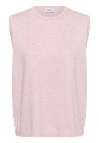 Beželis rožinis megztinis be rankovių su apvalia iškirpte, derinamas su tamsiai mėlynomis džinsomis. Megztinis turi laisvą siluetą ir glotnią tekstūrą.