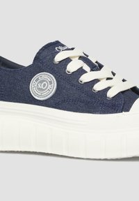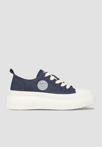 Tamsiai mėlynas žemo profilio sportbačiai su storu baltu padu, baltais raišteliais ir apskritu baltu logotipu šone.