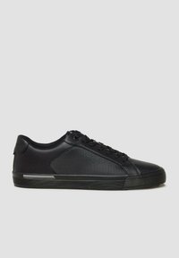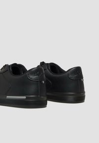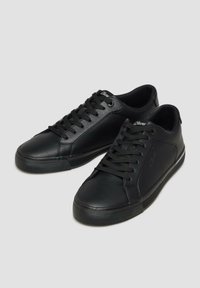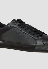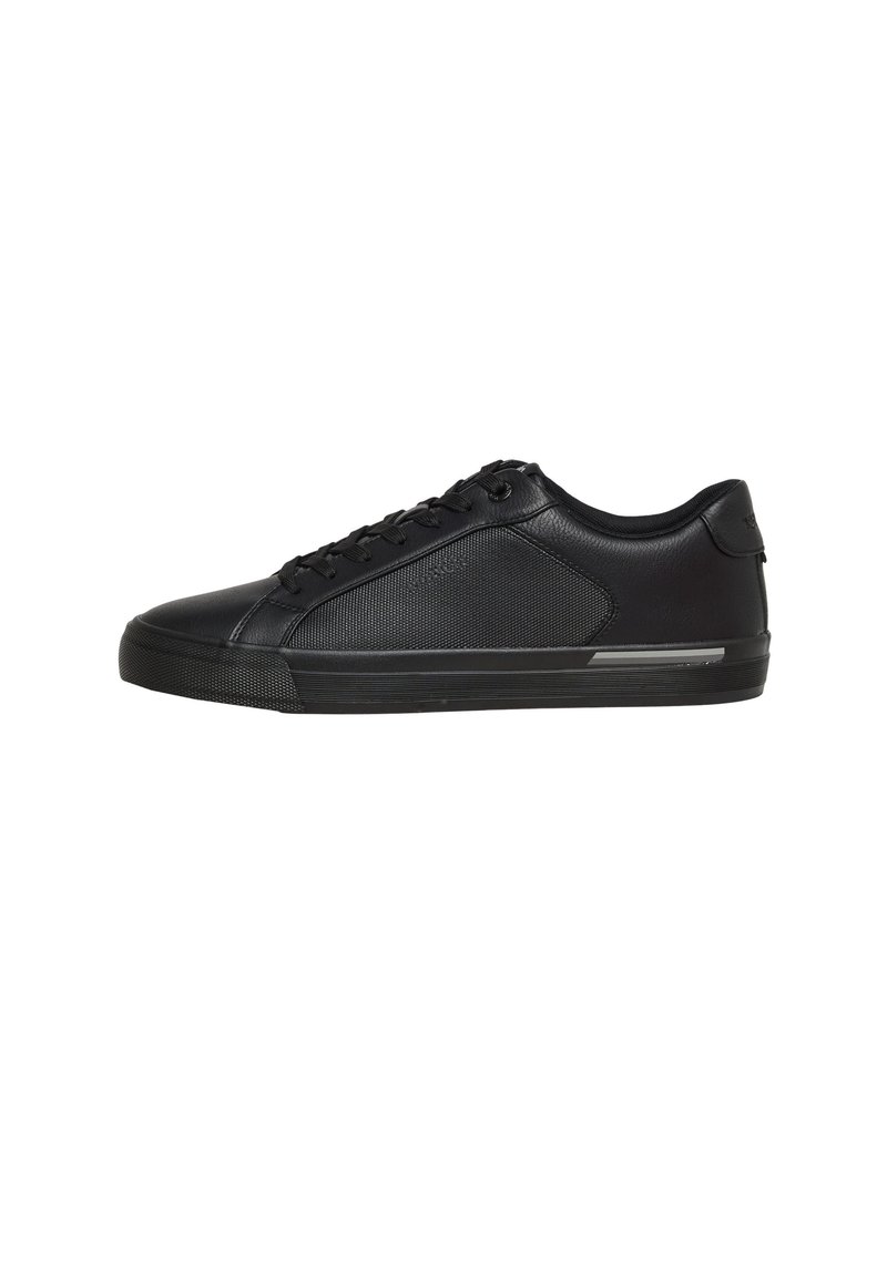 Juodi žemo profilio sportbačiai su tekstūruotu šoniniu paneliu, užsegami raišteliais ir plokščia gumine pado dalimi su maža atspindinčia juosta.
