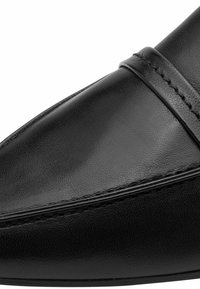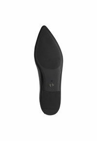 Juodos odinės loaferių bateliai su smailiu noseliu, kuriuose yra per priekį siūtas dirželis ir plokščias gumos padai. Lygi tekstūra.