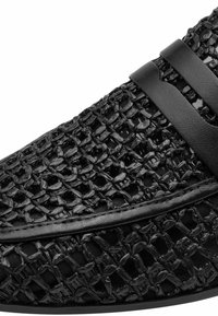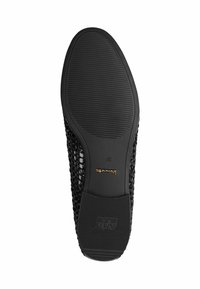 Juodi bateliai-sliparai iš tekstūruotos, austos medžiagos, su lygiu odiniu dirželiu per pėdos viršų ir žemu, plokščiu padu. Lengvo dizaino.