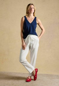 Moteris su blondiniais plaukais, vilkinti tamsiai mėlyną berankovį V formos kaklo viršų ir baltas kelnes, stovinti su viena ranka kišenėje, baltame fone.