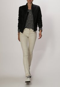 Moteris vilki juodą bomber stiliaus striukę su užtrauktuku, ribotais rankogaliais ir apačia, derinama su smėlio spalvos kelnėmis ant vienspalvio fono.