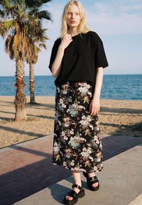 Šviesiaplaukė moteris stovi prie paplūdimio palmės, dėvi juodą oversized marškinėlį, gėlių midi sijoną ir juodus masyvius sandalų po skaidriu dangumi.