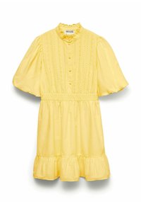 Šviesiai mėlyna trumpa suknelė su aukšta apykakle, pūstomis rankovėmis, priekiniais sagomis ir raukšlėtu atvartuku. Pagaminta iš medvilnės audinio su siuvinėjimo detalėmis.